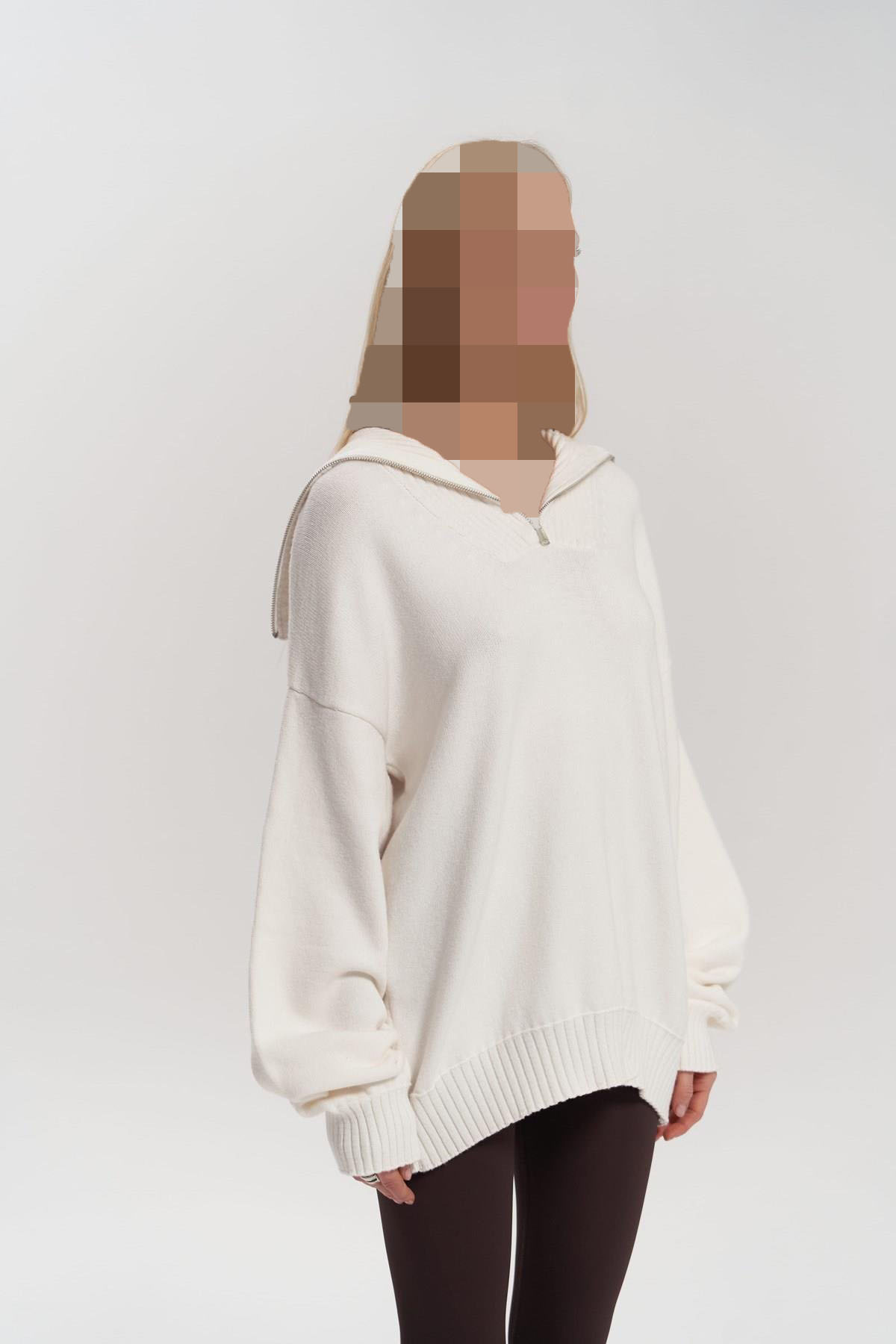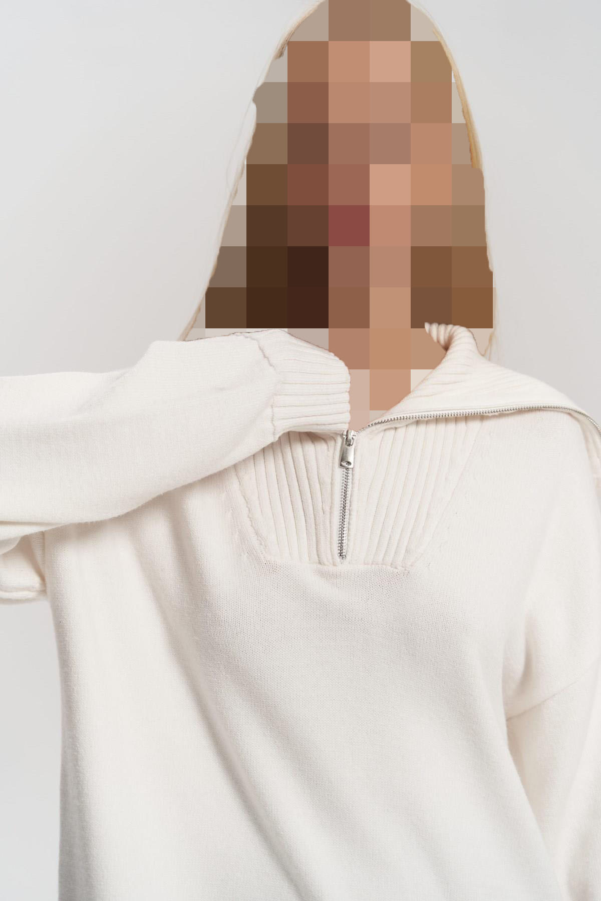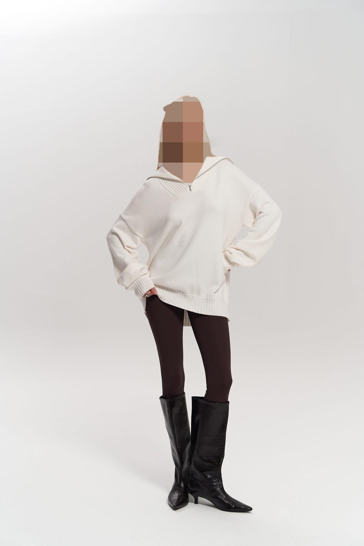 ژاکت بافتنی آستین بلند با سرآستین و لبهی چیندار. یقهی پهن و زیپدار.