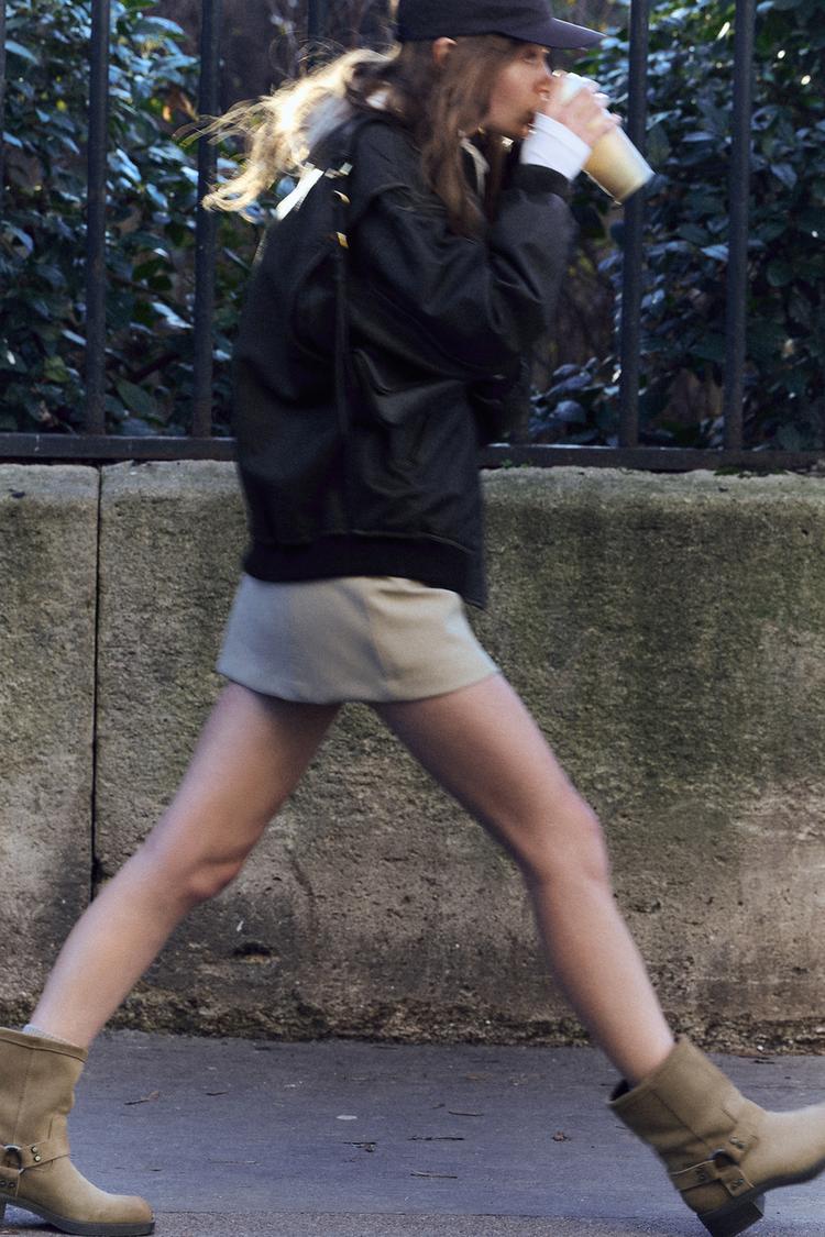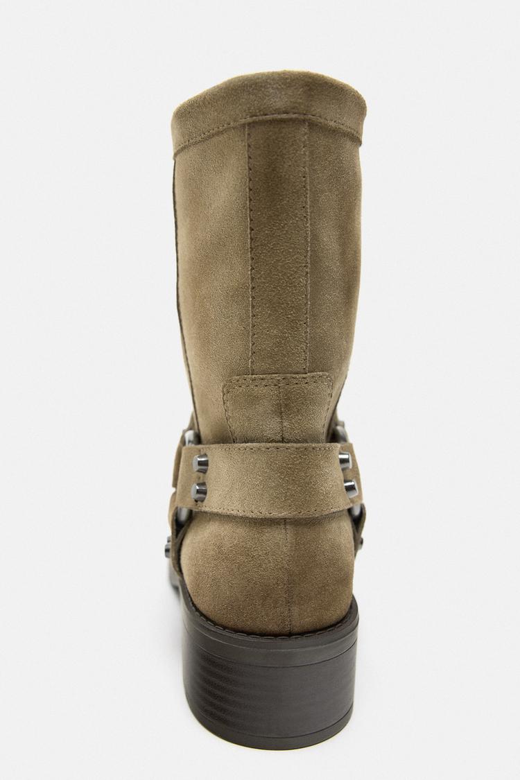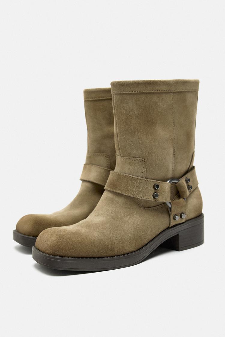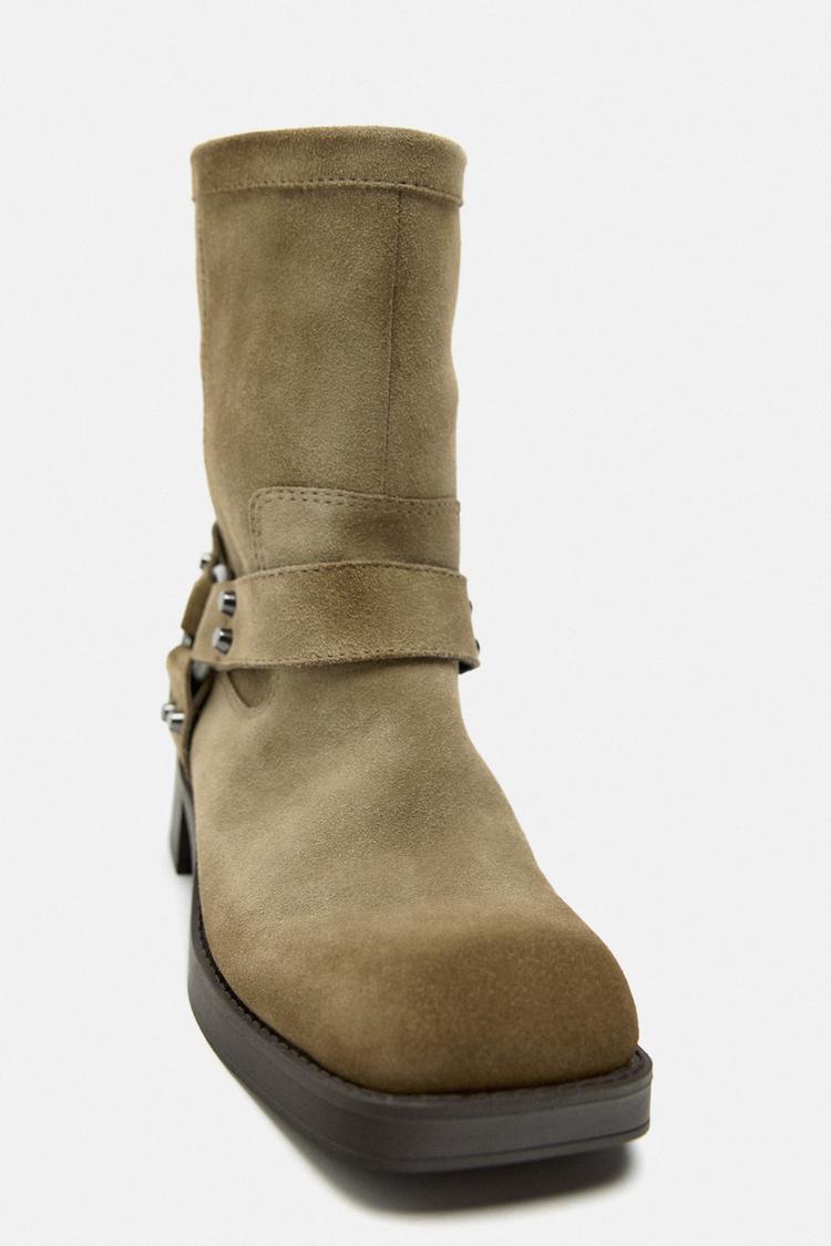 چکمههای جیر به سبک موتورسواری. بندهایی با یراق فلزی. پنجه مربعی.