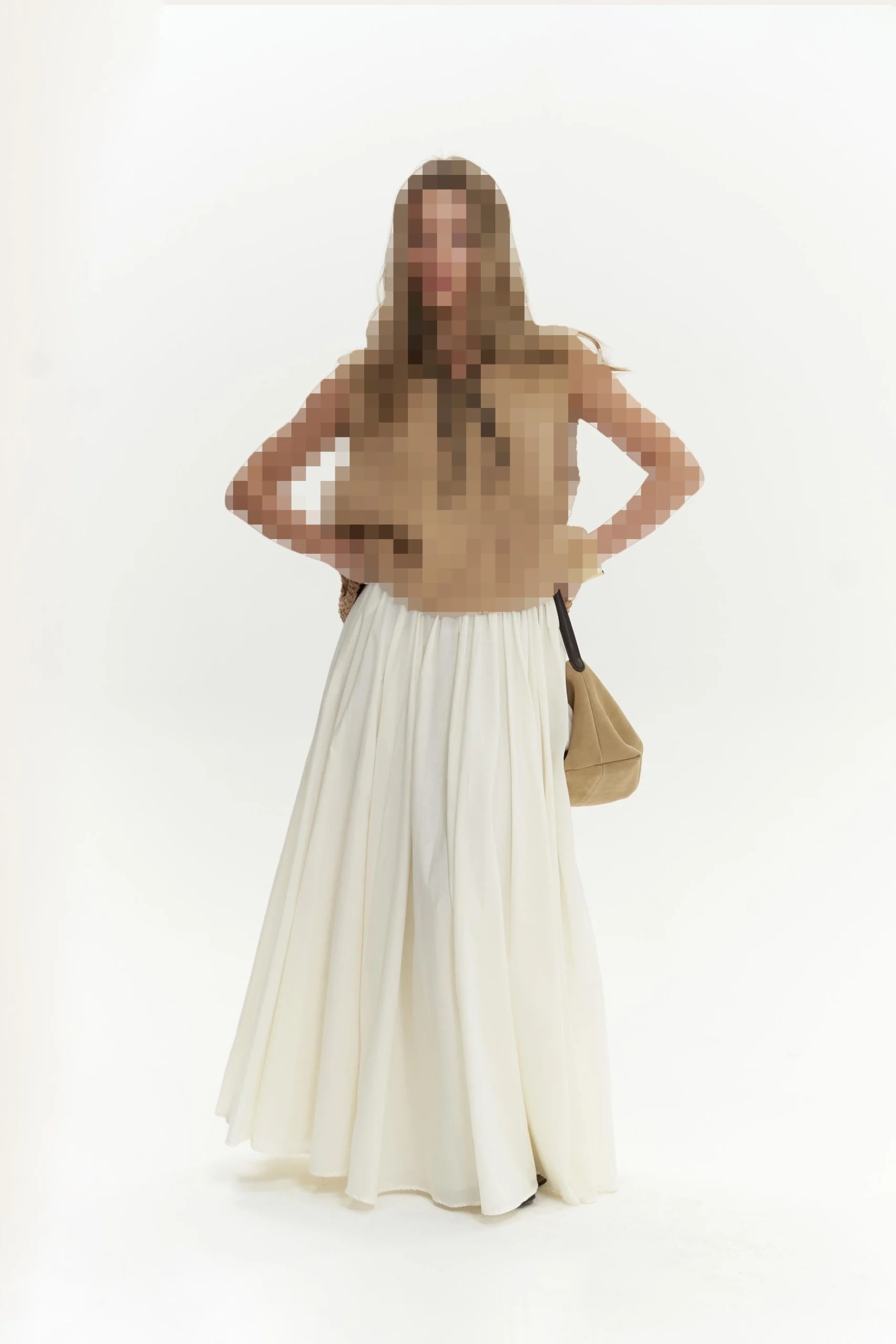 کمر بلند، جزئیات کمر بالا و دامن بلند پلیسه دار. دارای آستر و برش پهن.