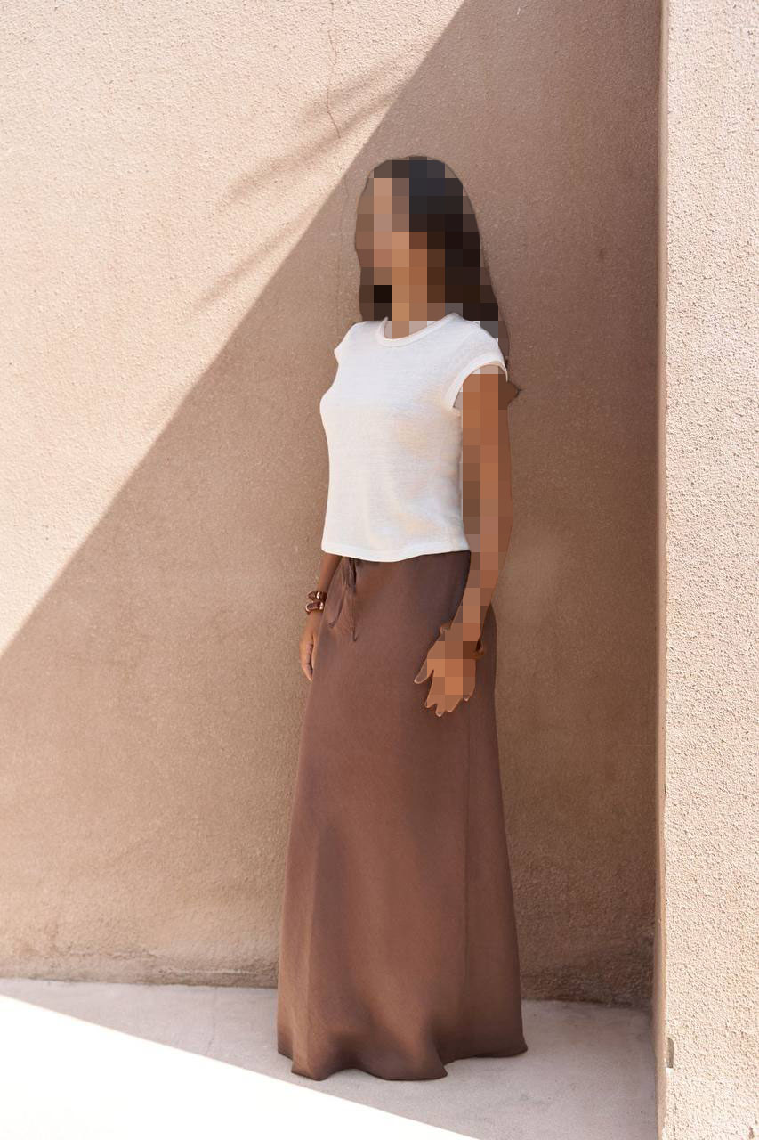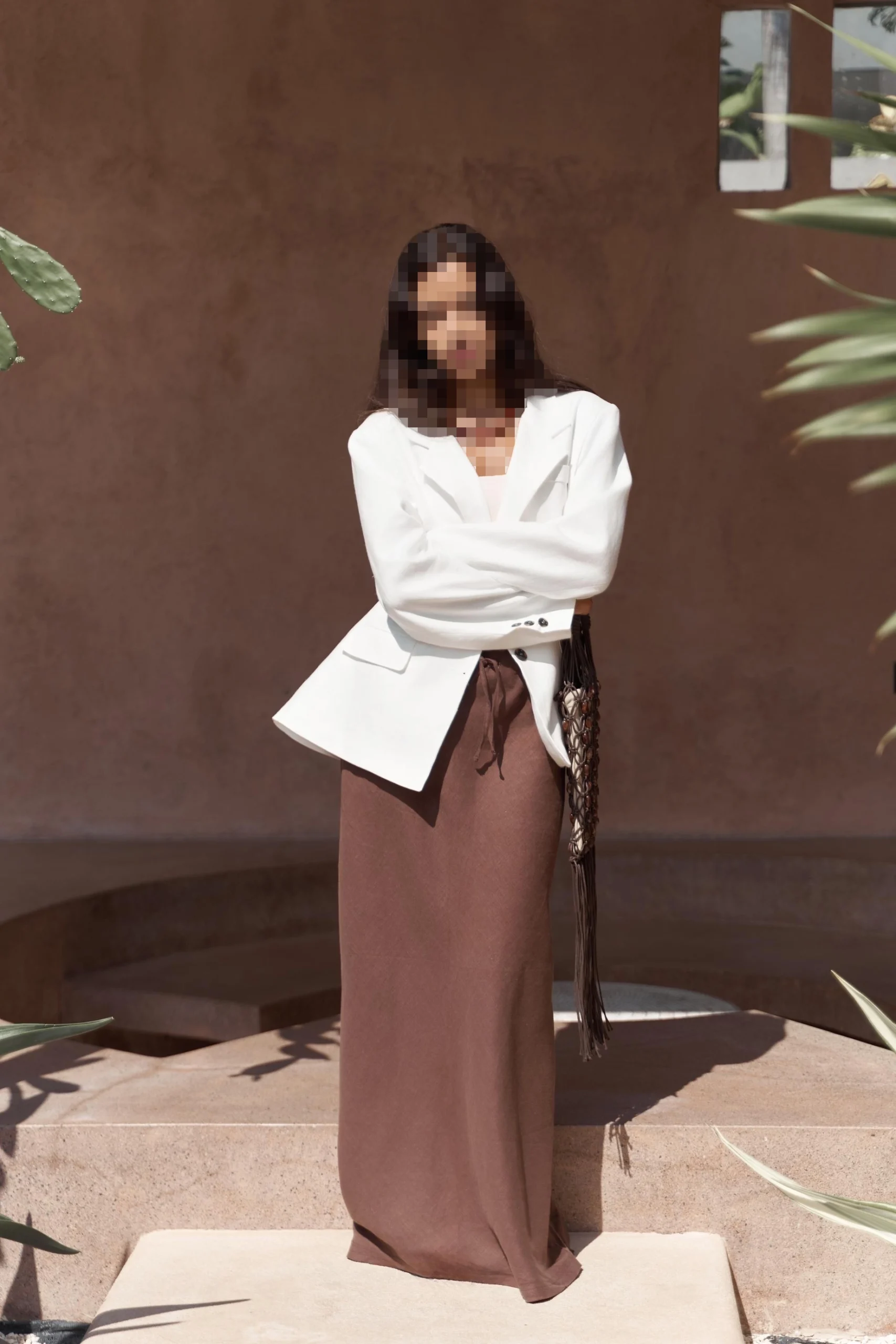 پارچه ۱۰۰٪ کتان، جزئیات کثیف، دامن بلند برش مستقیم. جزئیات توری قابل تنظیم در جلو.