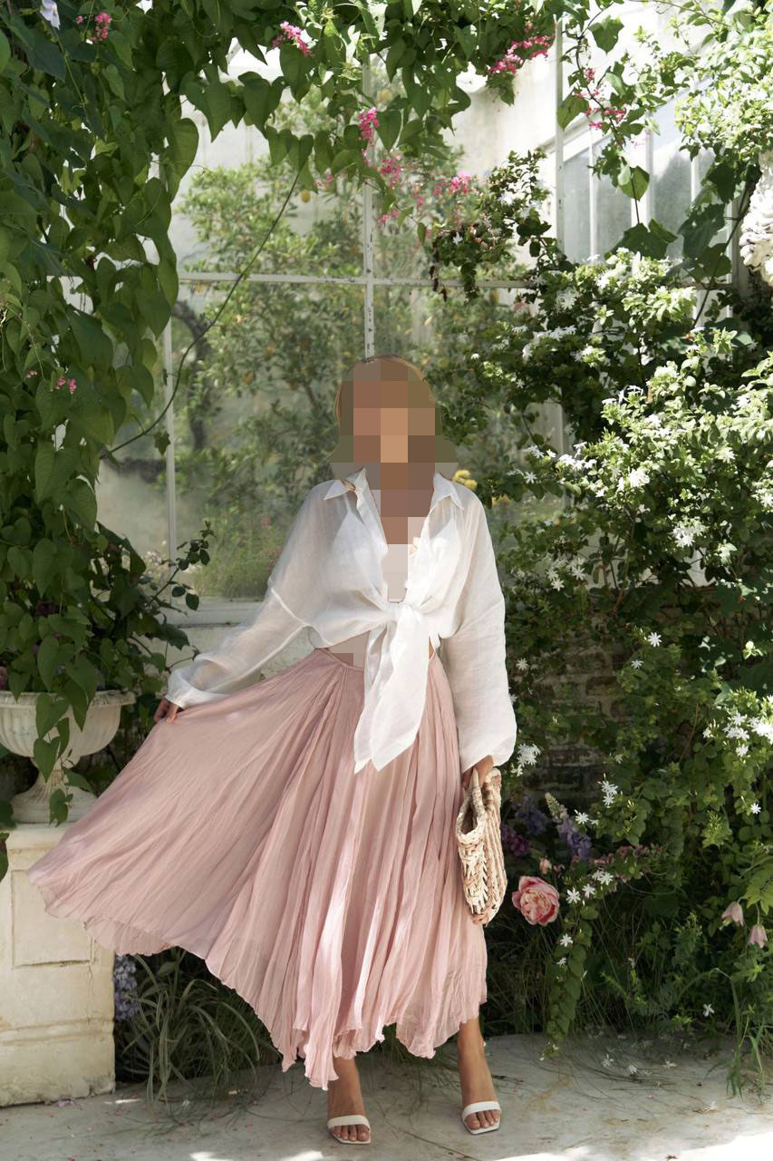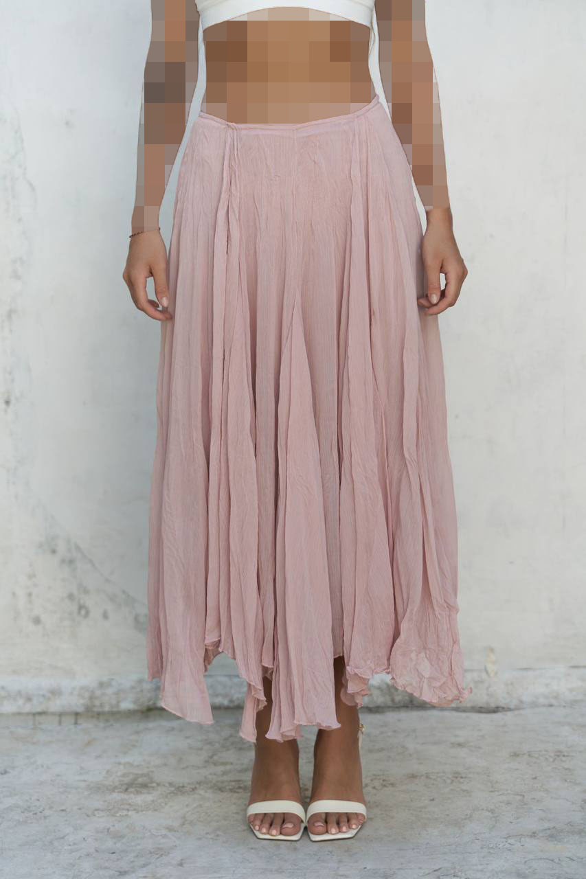 دامن بلند با بافت چیندار، سبک و روان. با کمر بلند، نامتقارن و لبه چیندار، ظاهری سرزنده ارائه میدهد. دو لایه.