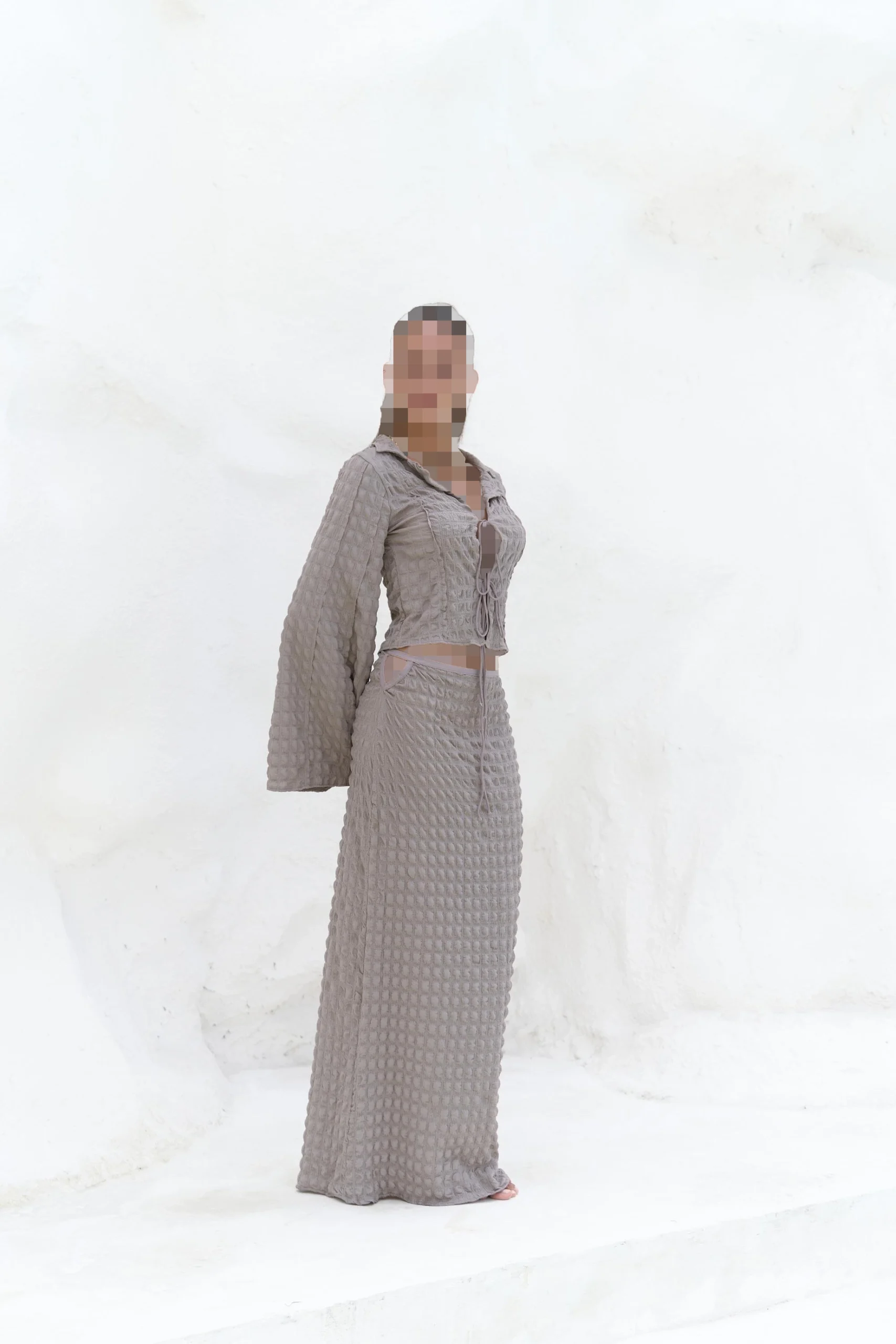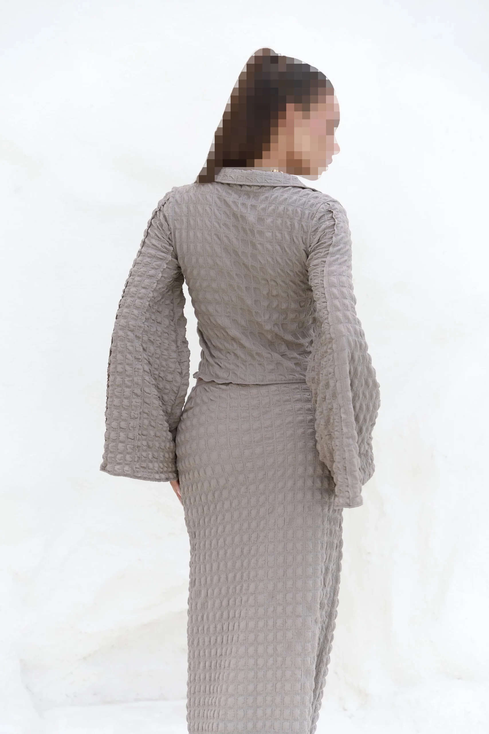 یقه برگردان، آستین بلند، مدل بافتدار. سرآستینها گشاد هستند و قسمت جلو دارای بندی با گره طنابی است. دامن میدی بافتدار A-line با کمر کشی و از همان پارچه ساخته شده است. جزئیات پنجره برش خورده کناری. بدون آستر.