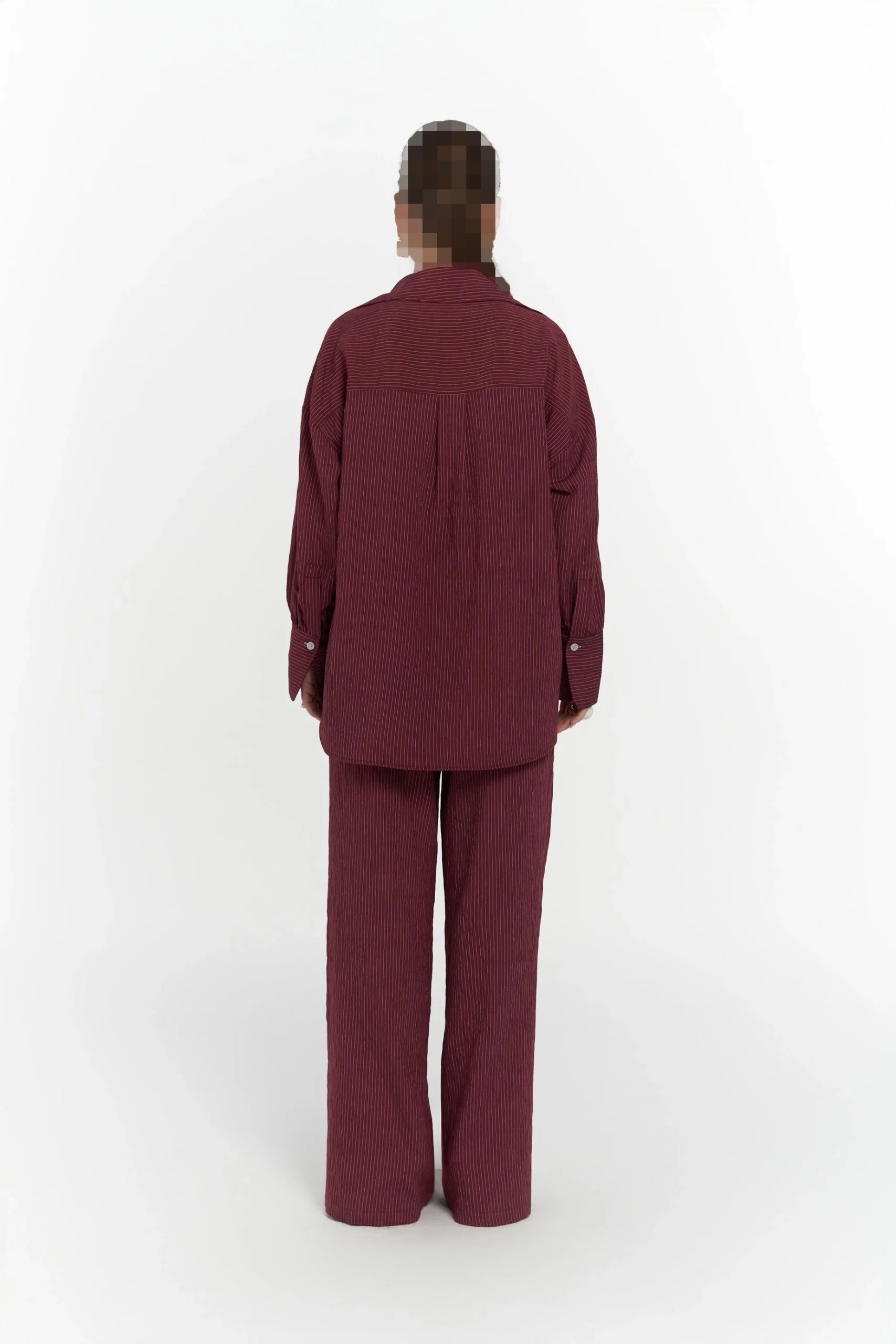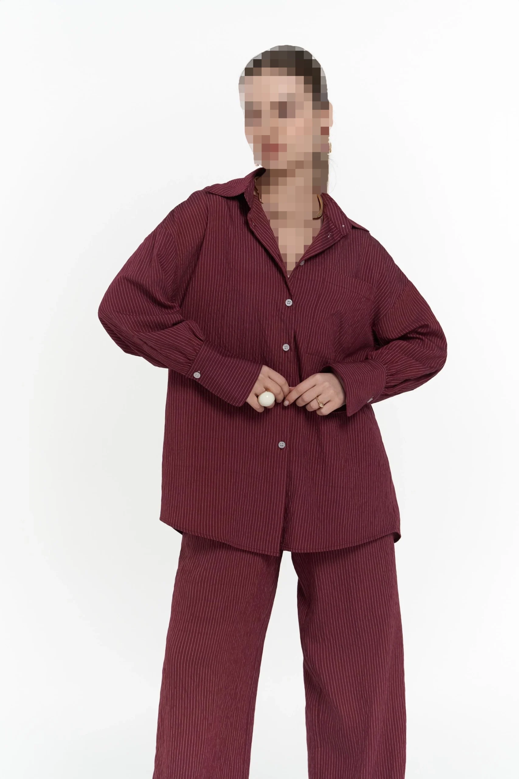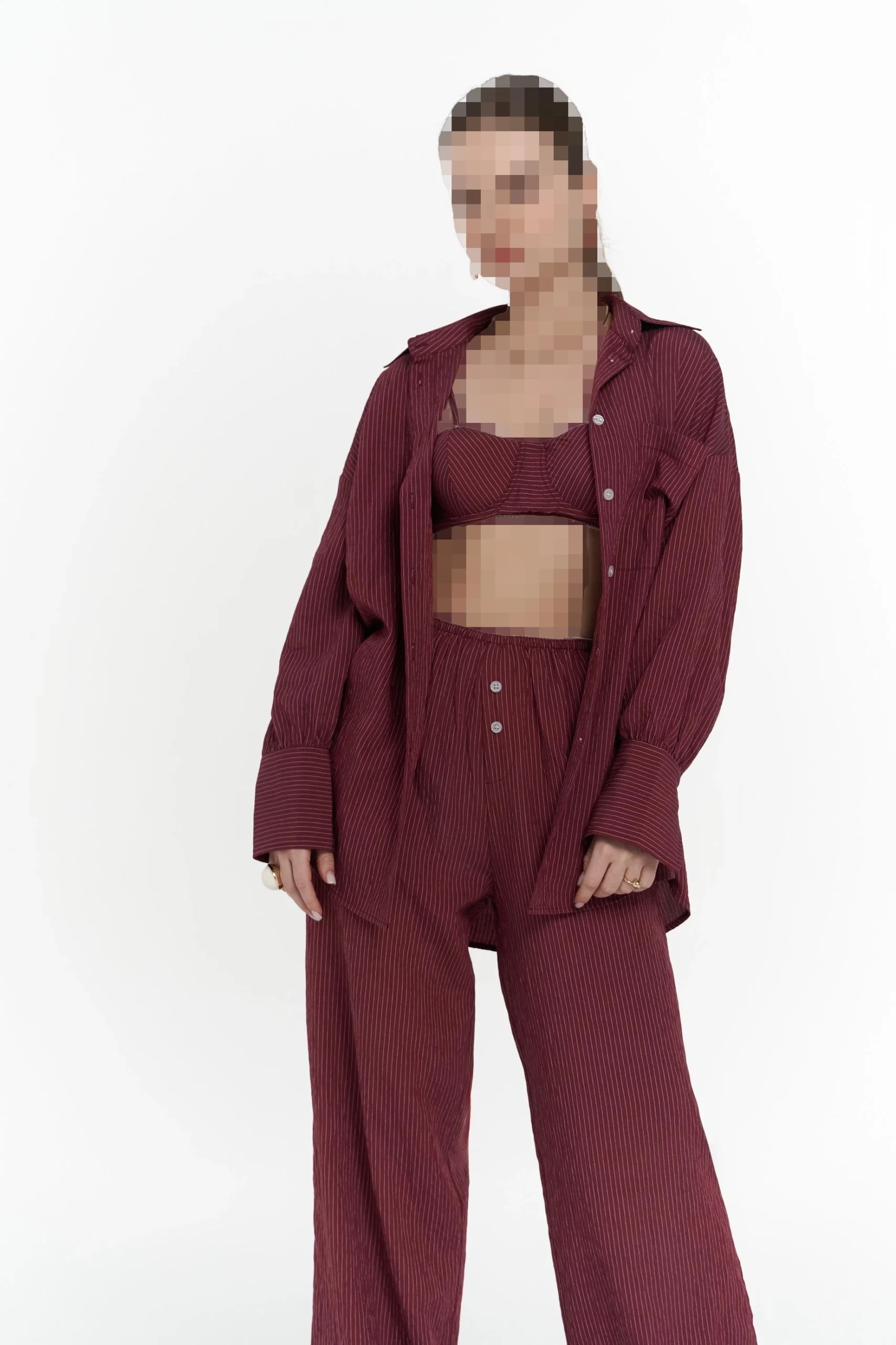 این ست شامل یک پیراهن راه راه، تاپ کوتاه و شلوار از جنس پارچه ترکیبی نخی است. پیراهن آستین بلند با یقه کلاسیک، جلو دکمهدار، شانههای کمی افتاده و یک جیب باز روی سینه.