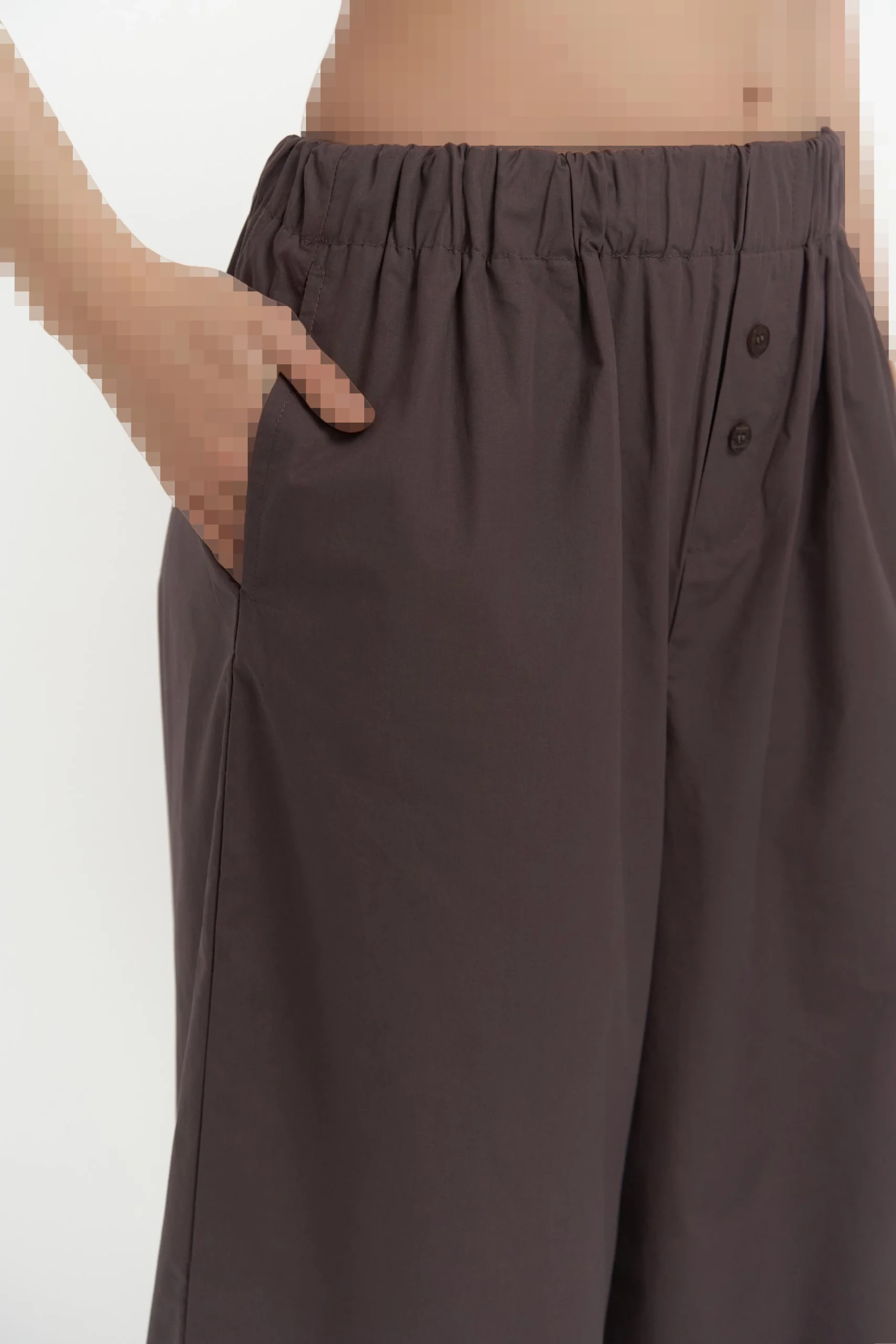 شلوار راحتی گشاد با برش معمولی، کمر کشی و طراحی دکمهدار دقیق.
