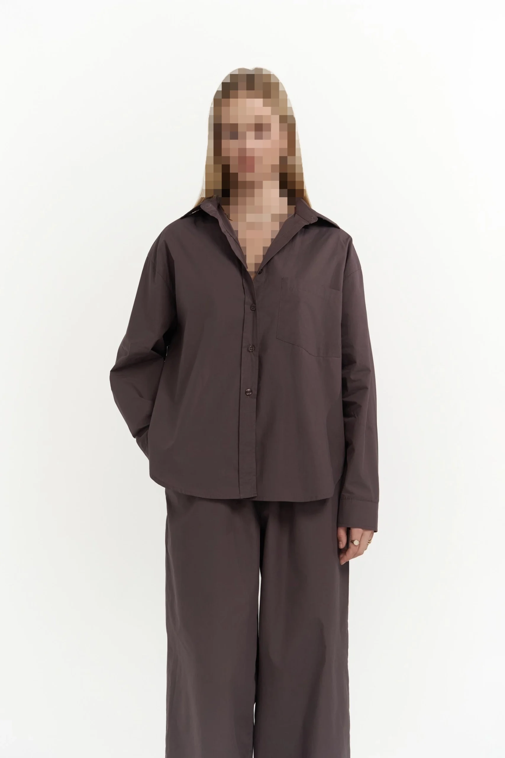 پیراهنی با یقهی کوبایی پهن و آستینهای بلند، فرمی راحت و آزاد دارد. بسته شدن دکمه.