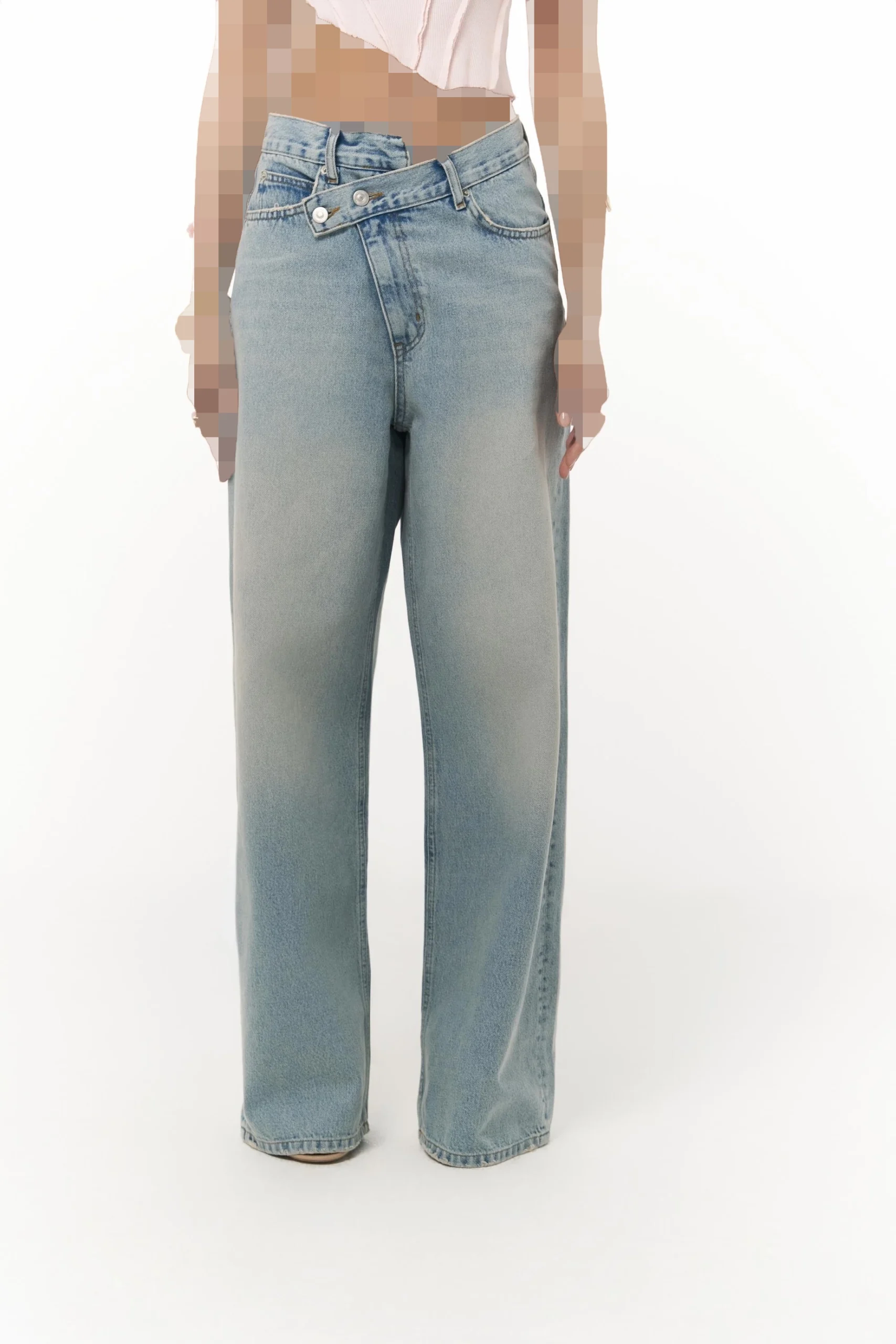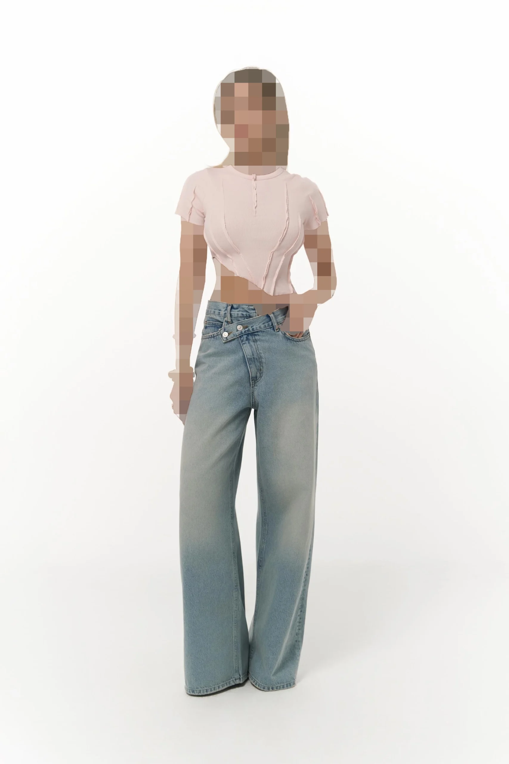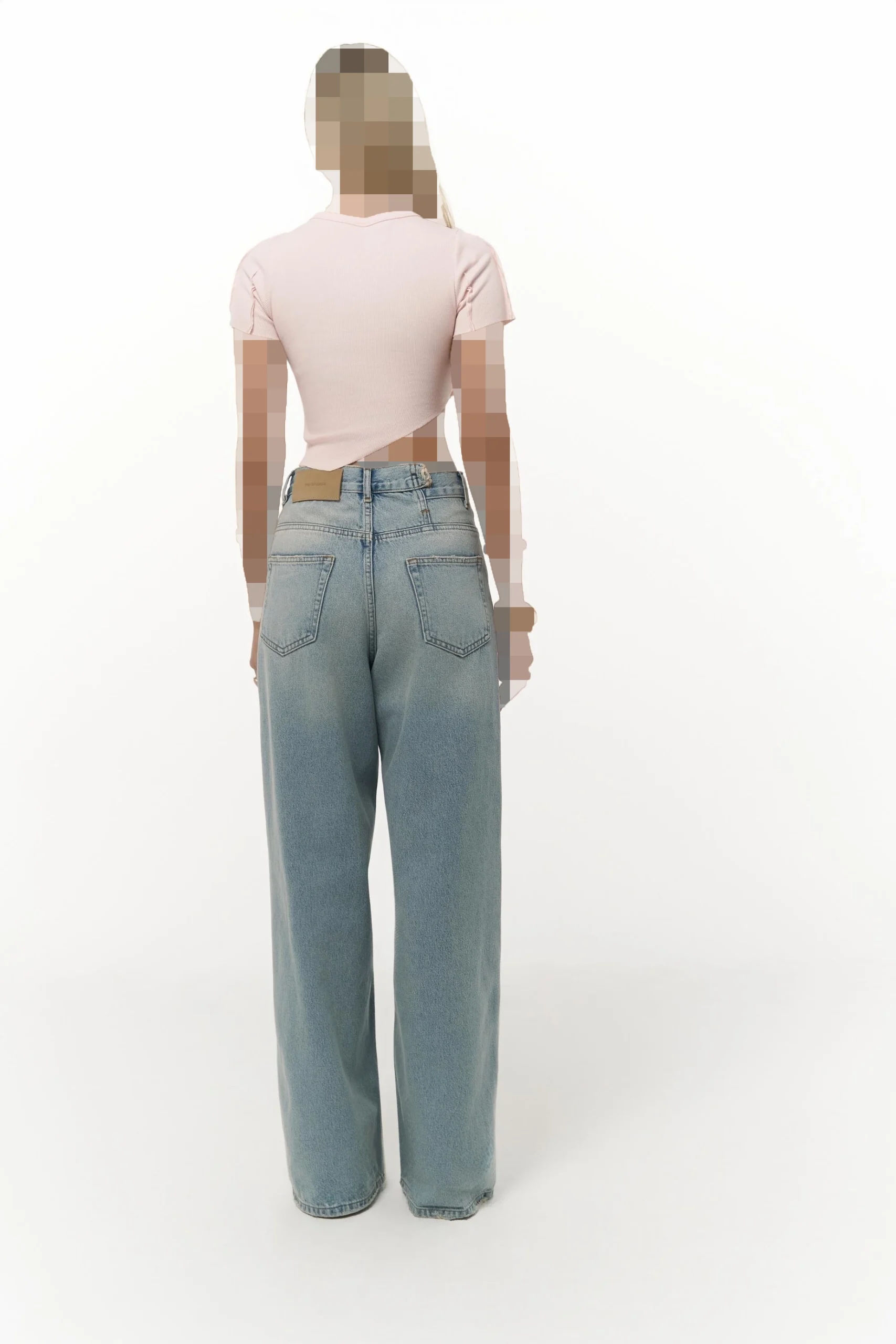 شلوار جین گشاد و آبی متضاد با کمر بلند. پنج جیب، زیپ جلو و دکمه فلزی برای بستن.