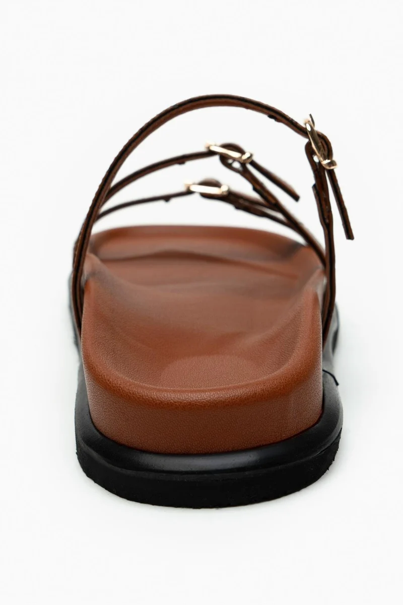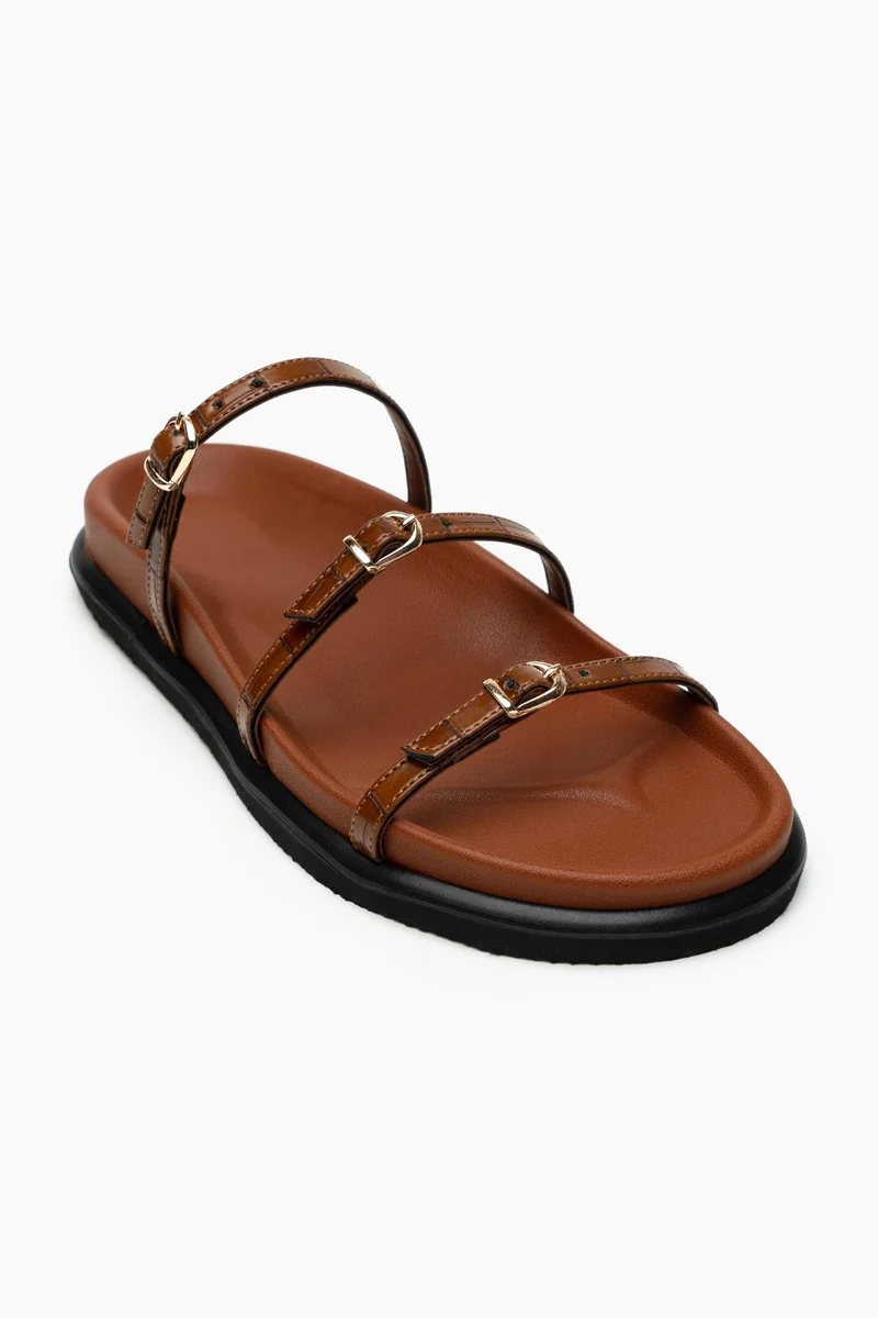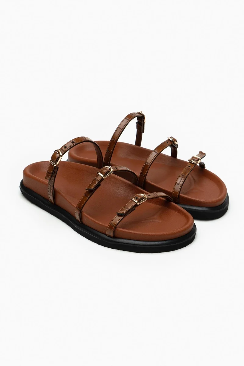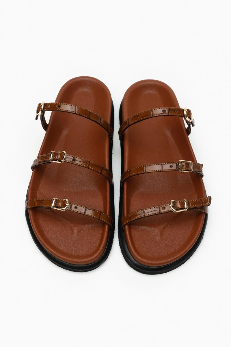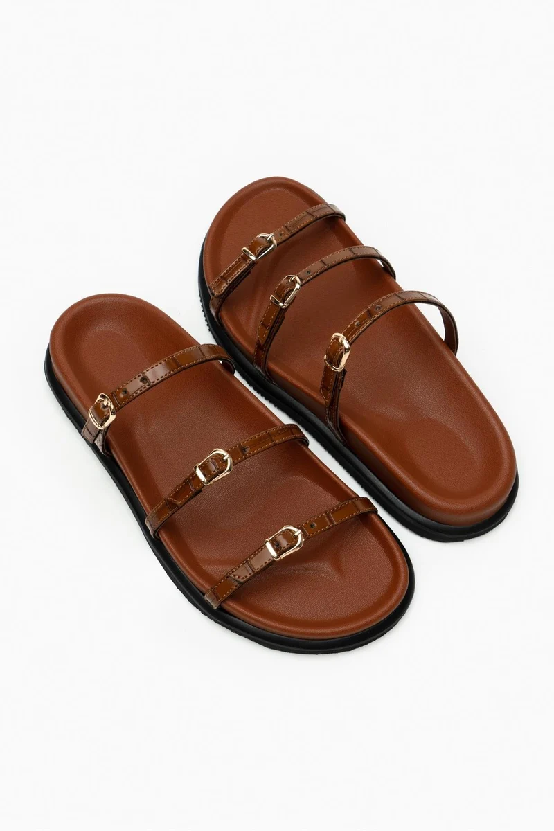 صندل زنانه کف تخت قهوه ای سه سگک طرح دار لیسبث