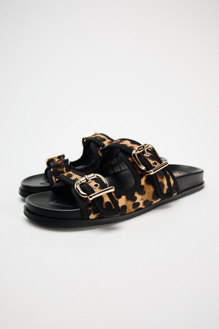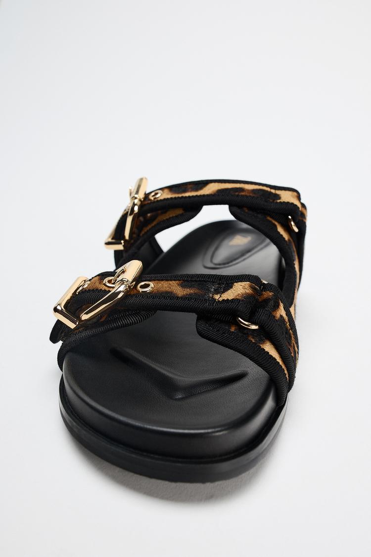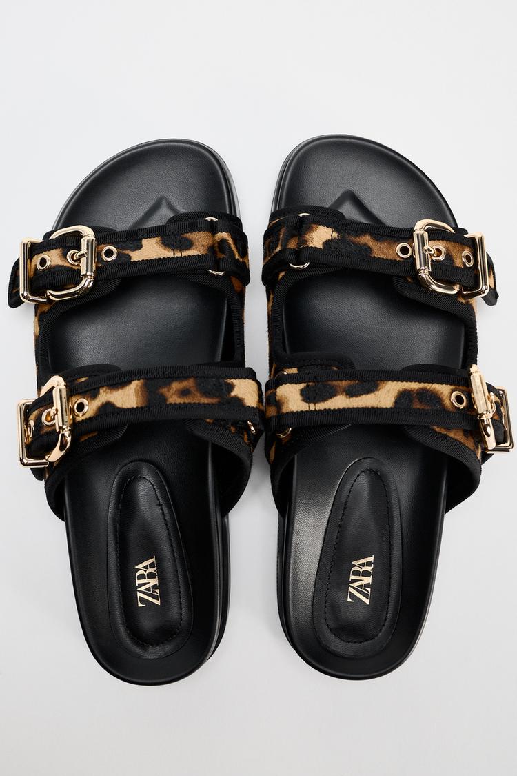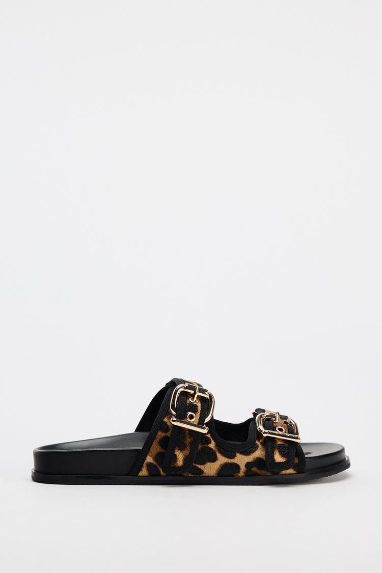 صندلهای تخت چرمی با طرح خز مصنوعی و طرح حیوانات. سگکهای پهن. بینی گرد.