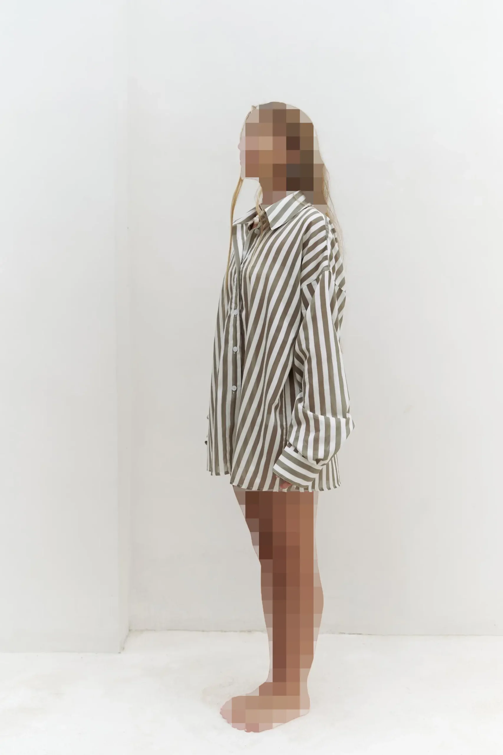 پیراهن راه راه گشاد از جنس نخ پنبه. یقه گرد و آستین بلند با سرآستین.