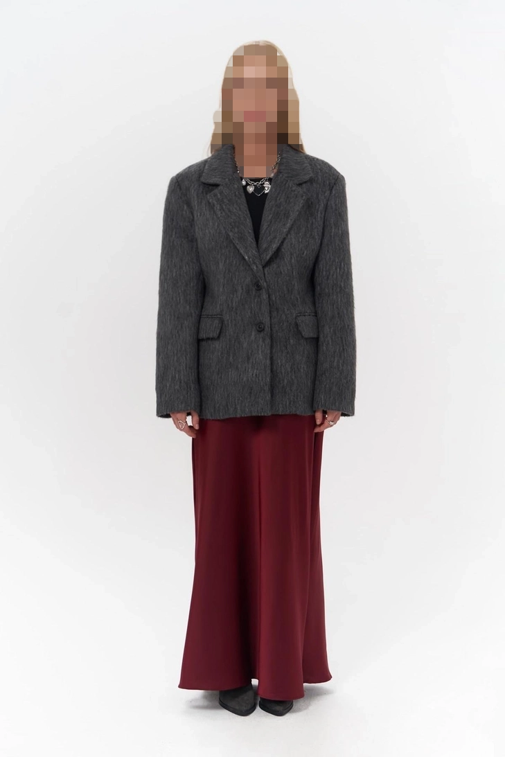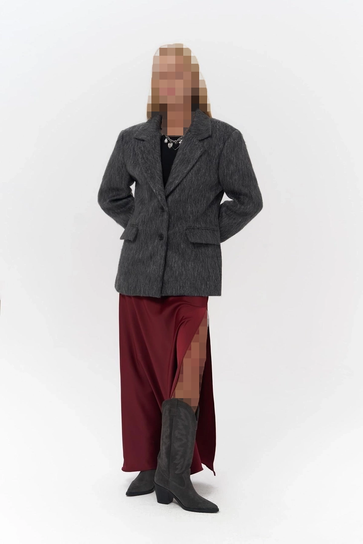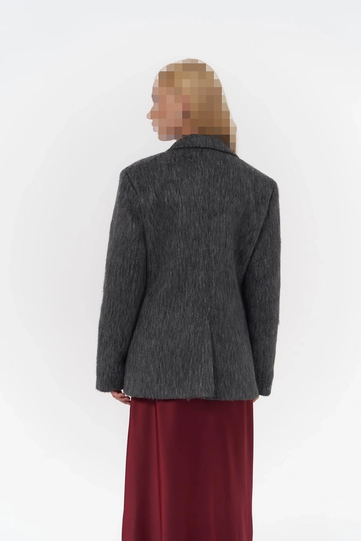 ژاکت بلیزر بافت دار با بسته شدن دکمه دو سینه، پد شانه ای، آستین بلند، جزئیات یقه و بافت نزدیک. جیب فلپ جلو و آستر.