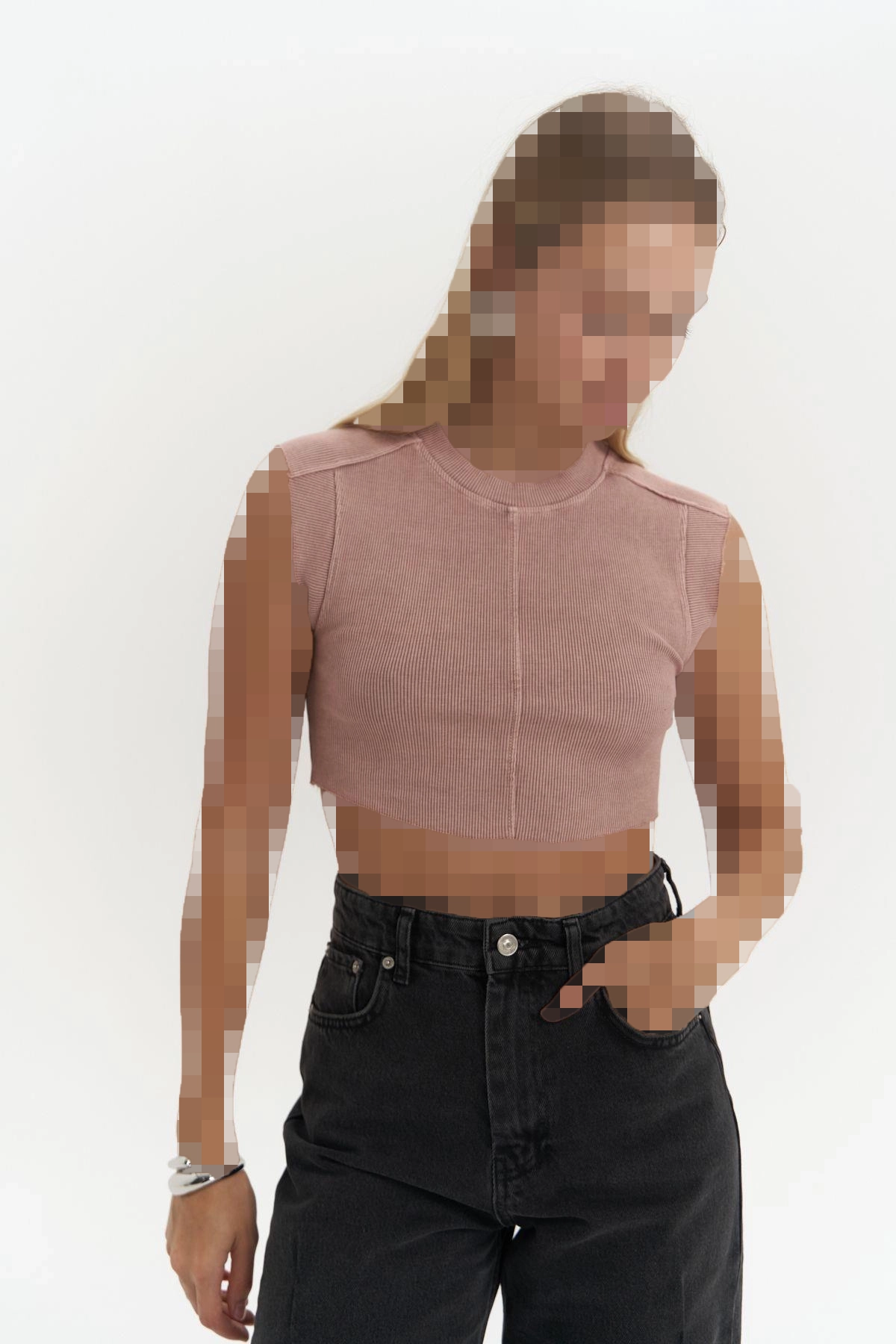 تاپ کوتاه از جنس پارچه راه راه شسته شده، آستین کوتاه، یقه گرد و نخی رنگ شده کمرنگ.