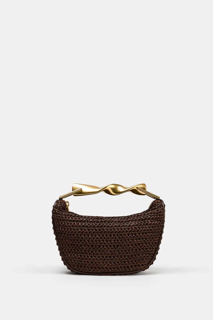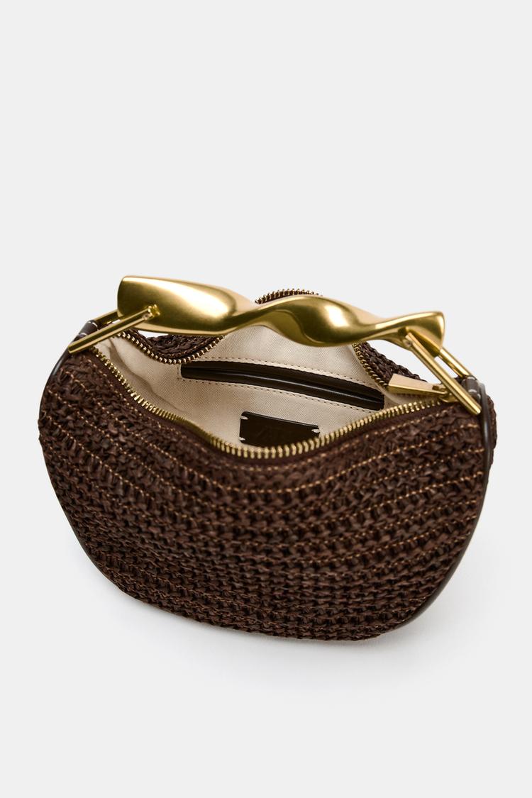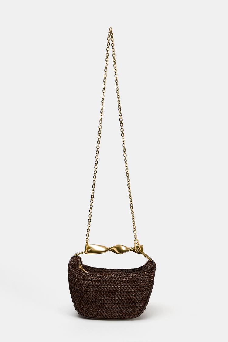کیف کوچک بافته شده با رویه بافته شده. دسته فلزی طلایی و بند دوشی دوتایی قابل تنظیم و جداشونده. جیب داخلی و آستردار. زیپ دار.