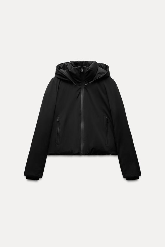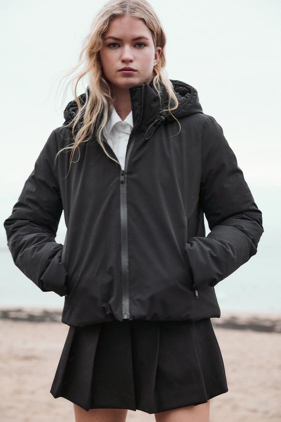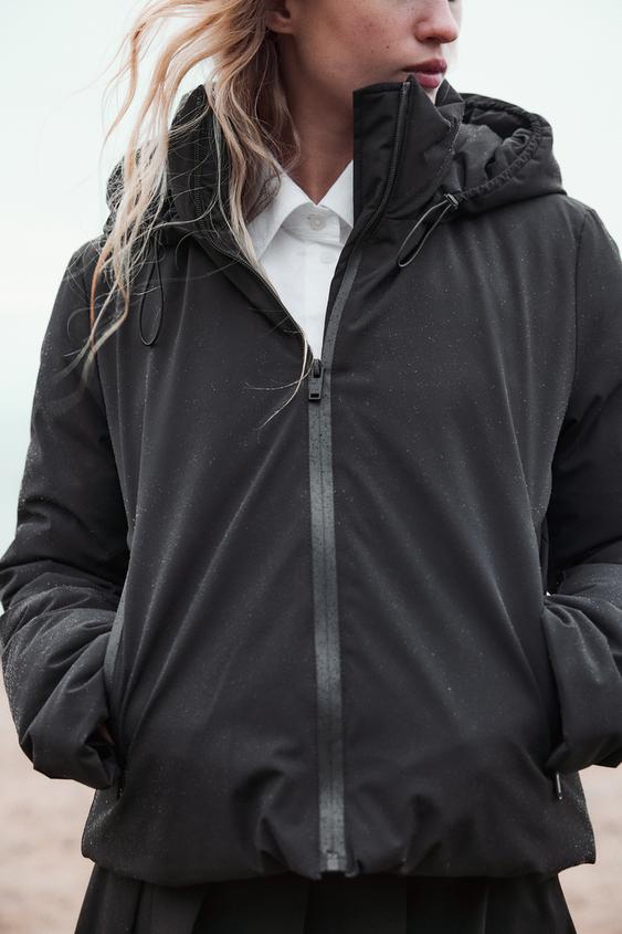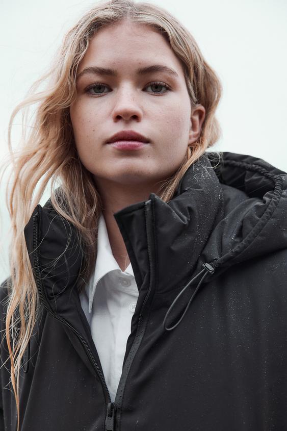 یقه بلند با هود قابل تنظیم با طناب کششی الاستیک و درپوش.